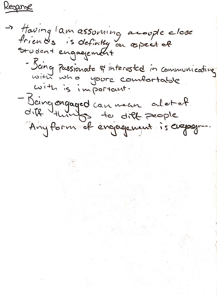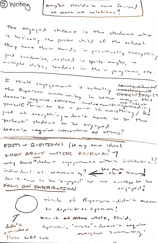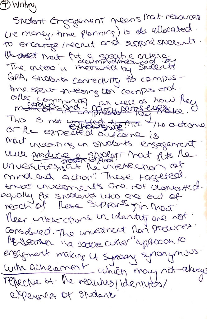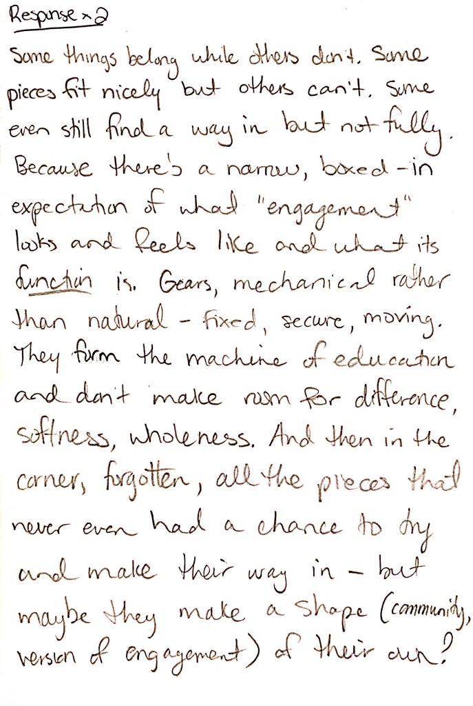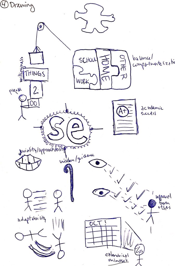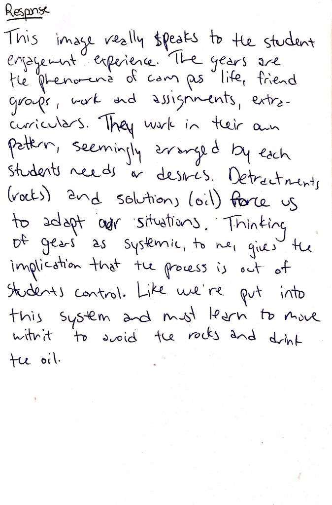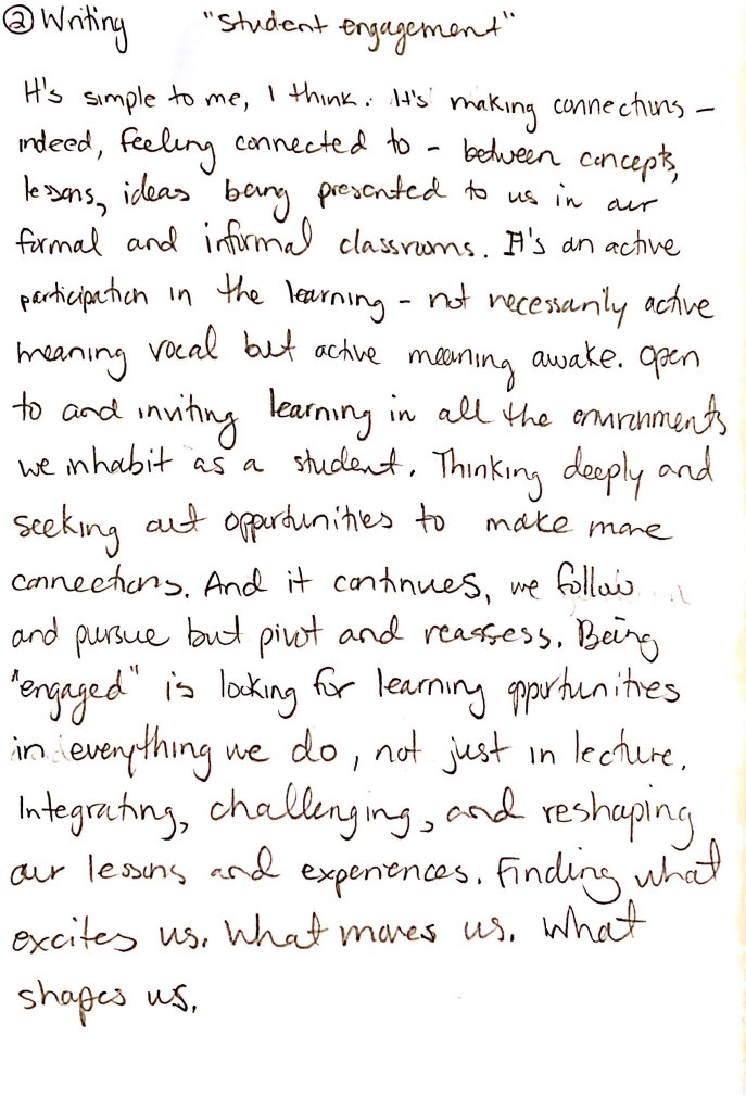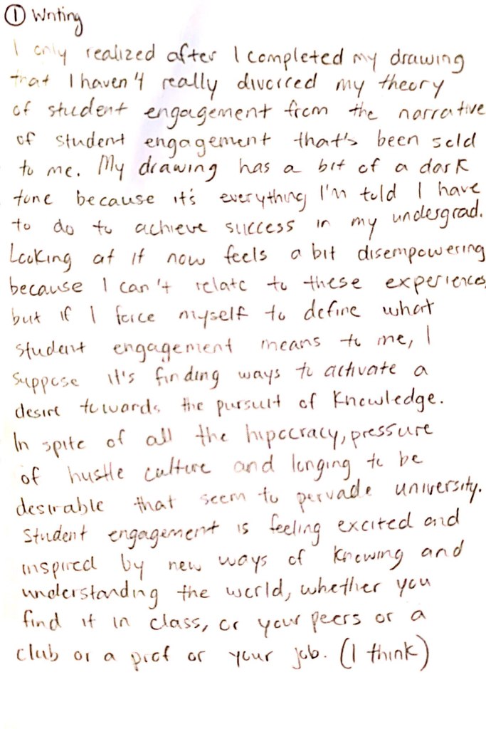 The so-called “non-objectifying visual analysis” (NOVA) exercise is a tricky one to explain and facilitate – I’ll do my best to write it out. To begin NOVA, each of us draws an image in response to a prompt – in our case, for our first NOVA we considered our personal definitions of student engagement.