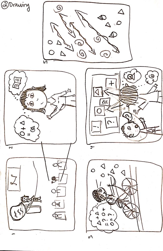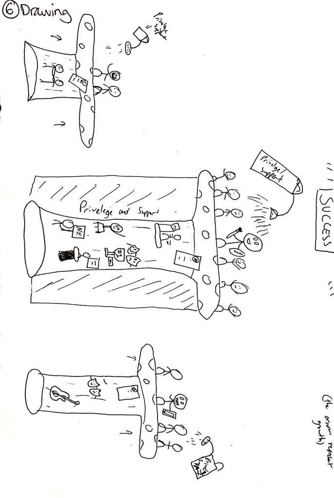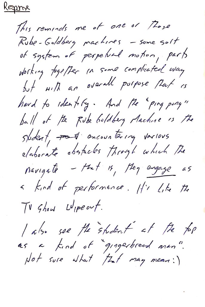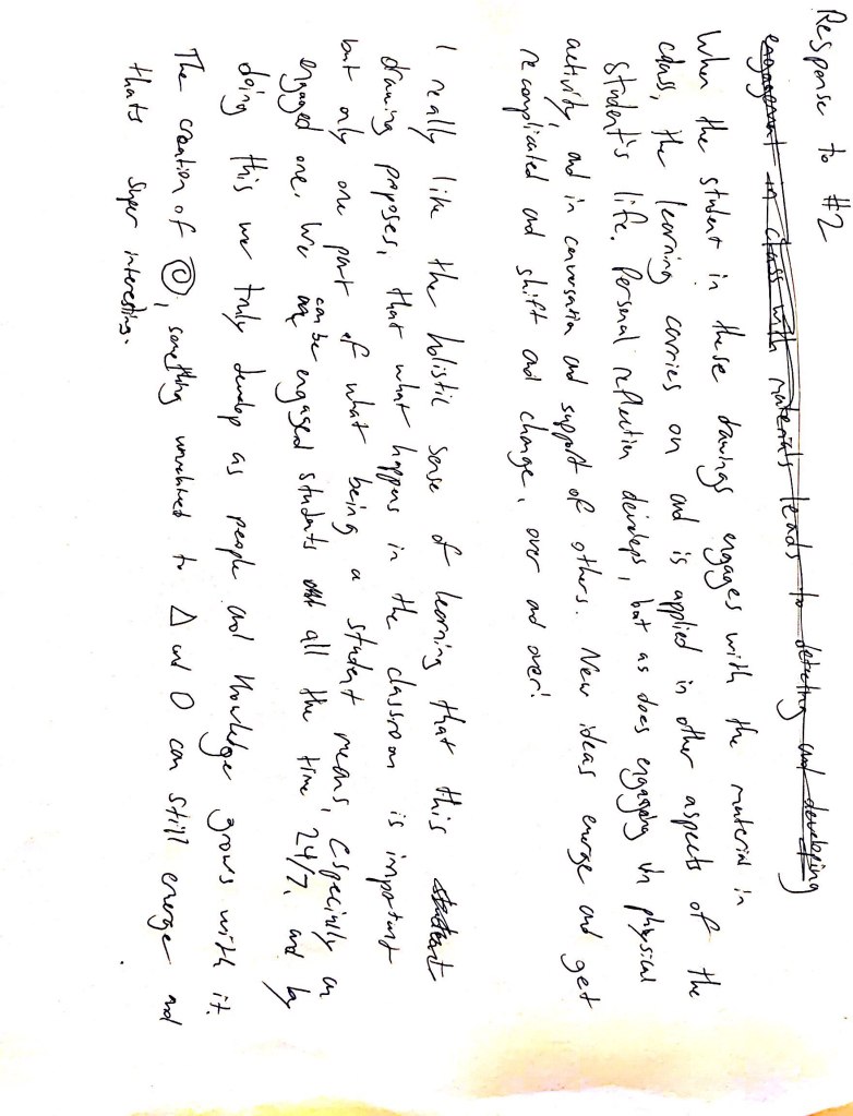 So, how the activity works. Each of us writes an explanation of that drawing of ours, creating a written response to the same prompt. Then, the drawings are circled around the group and another team member interprets the drawing, writing an accompanying note in response. So, first the drawings are interpreted by someone else without their accompanying explanation. Next, the drawings and their creator’s explanation are circled around the group and again, a fellow team-member responds to these – this time responding to both the drawing and its accompanying explanation.