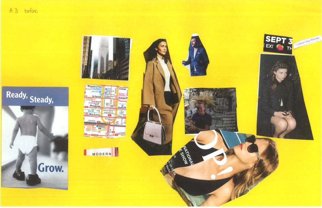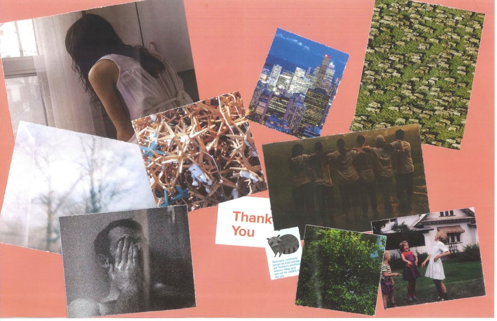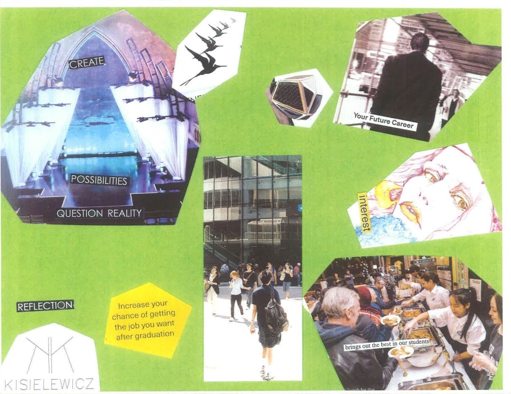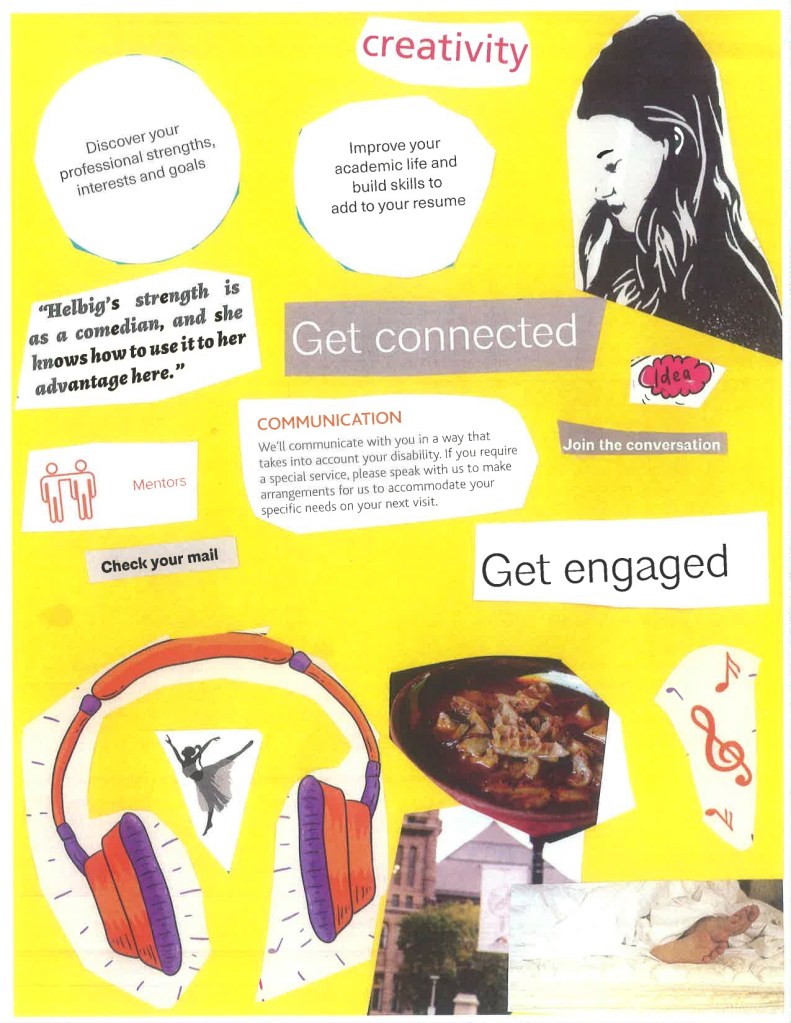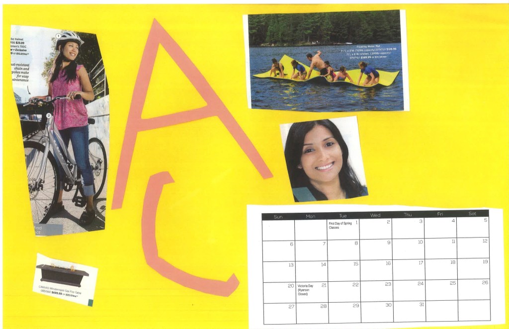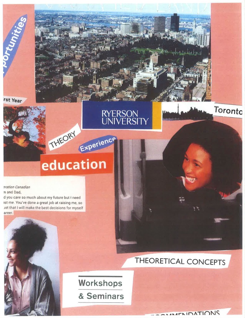 Over the course of our focus groups, we engaged a total of seventeen participants in collage-making as a form of eliciting narratives about their student experience, representing in turn the following questions: A) What did you envision coming into post-secondary education? B) What is your actual lived experience as a Ryerson student? Through the making of these collages and the ensuing reflective conversations, we hoped to elicit responses and stories from students about their expectations and experiences in university and whether there were interesting relationships to be noticed.
