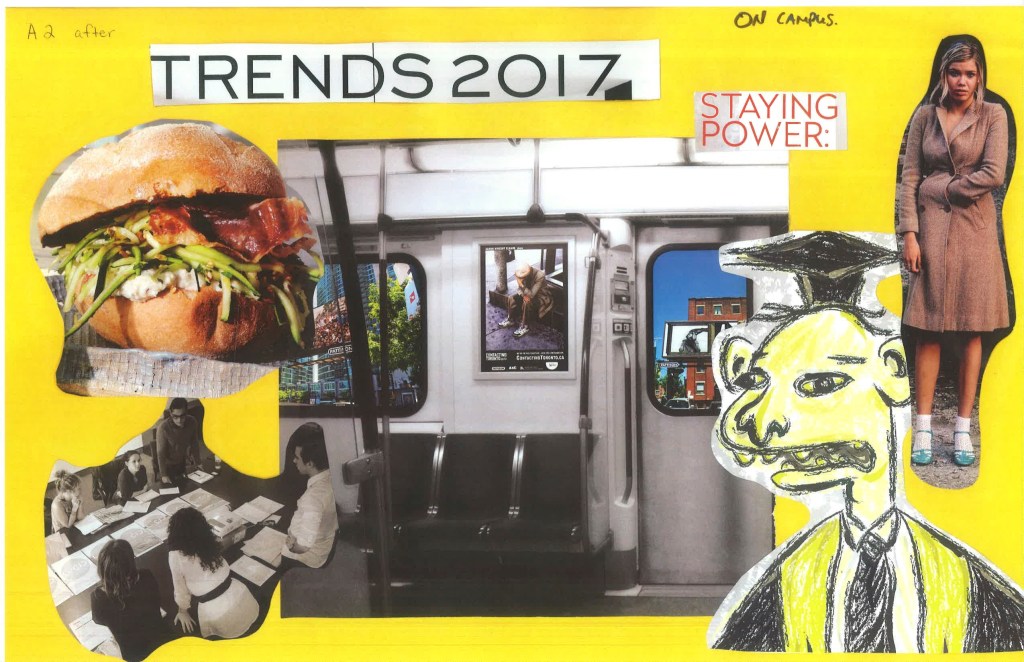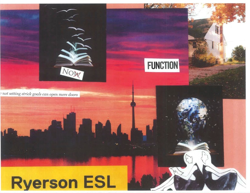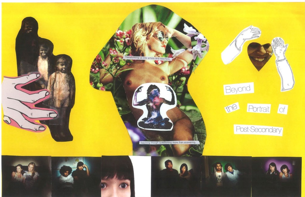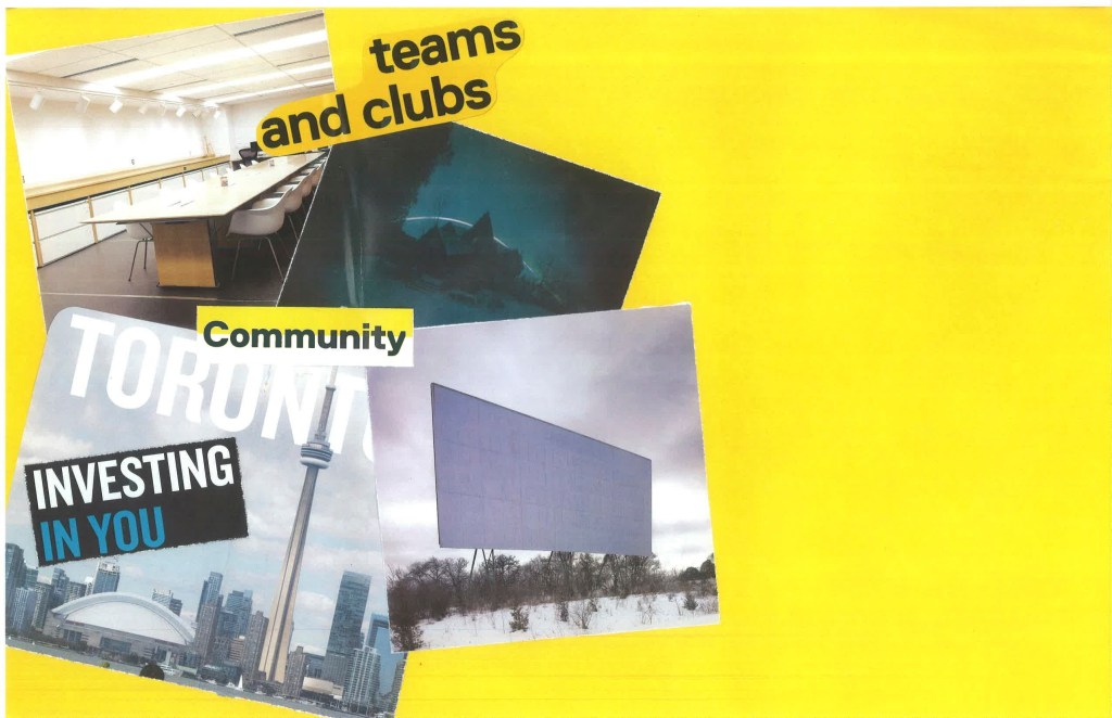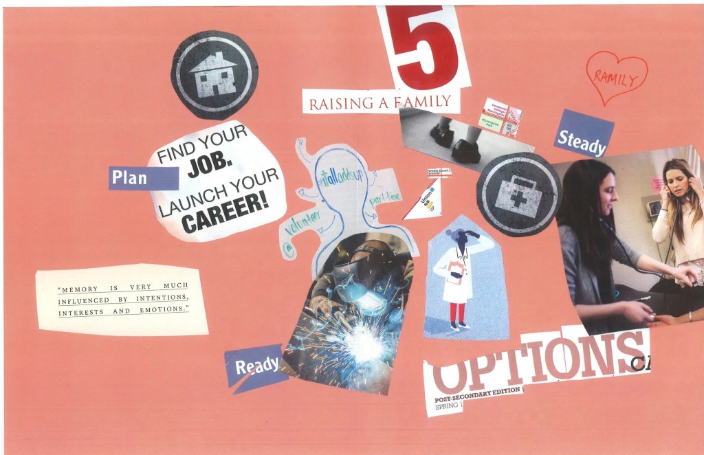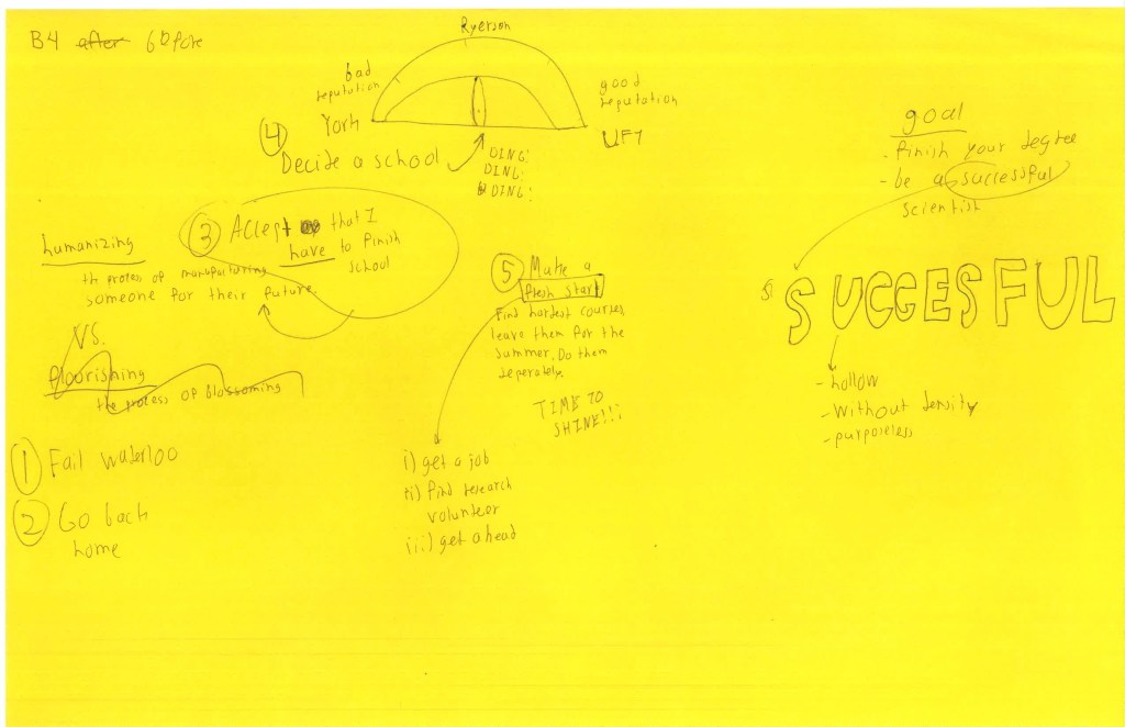 Over the course of our focus groups, we engaged a total of seventeen participants in collage-making as a form of eliciting narratives about their student experience, representing in turn the following questions: A) What did you envision coming into post-secondary education? B) What is your actual lived experience as a Ryerson student? Through the making of these collages and the ensuing reflective conversations, we hoped to elicit responses and stories from students about their expectations and experiences in university and whether there were interesting relationships to be noticed.